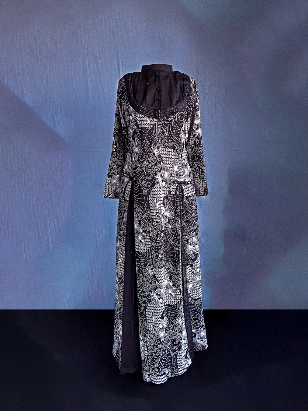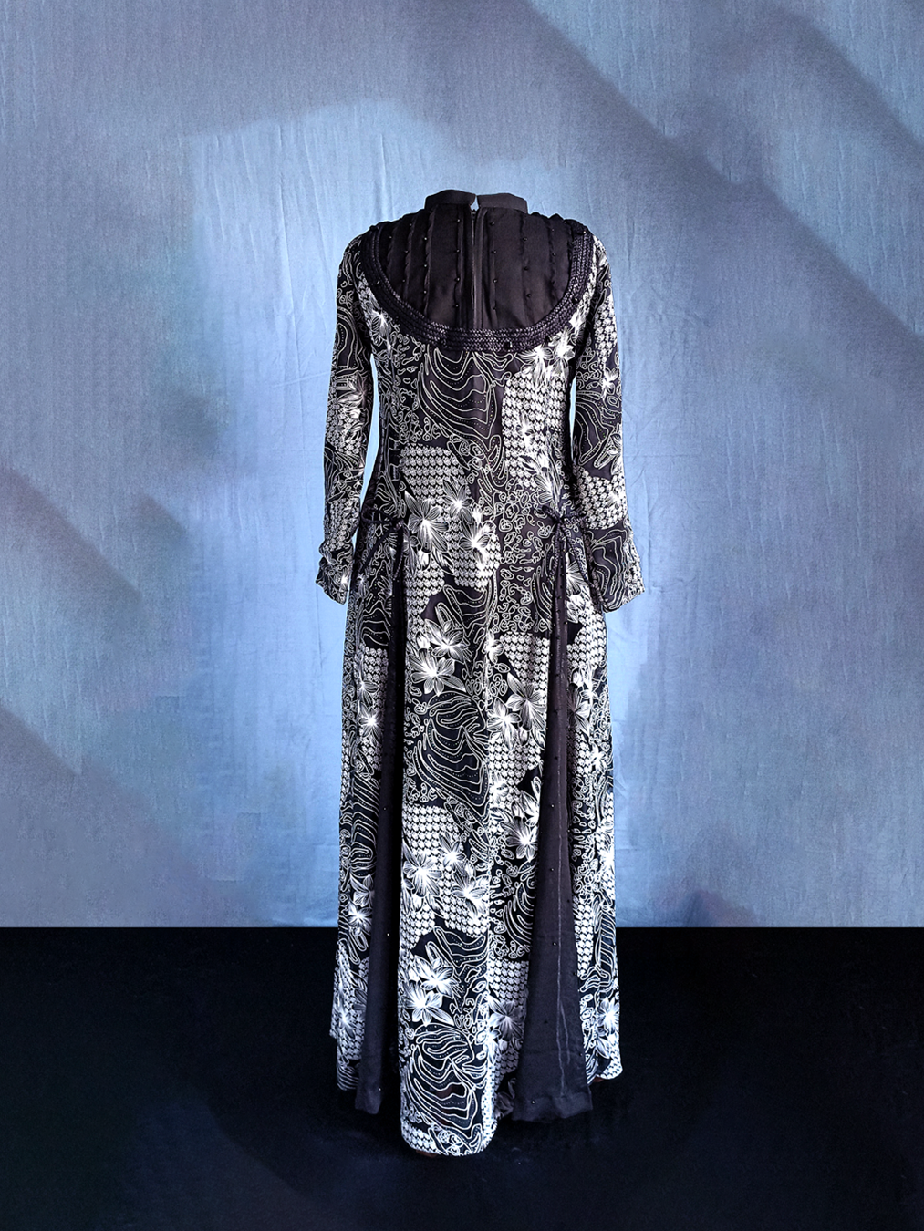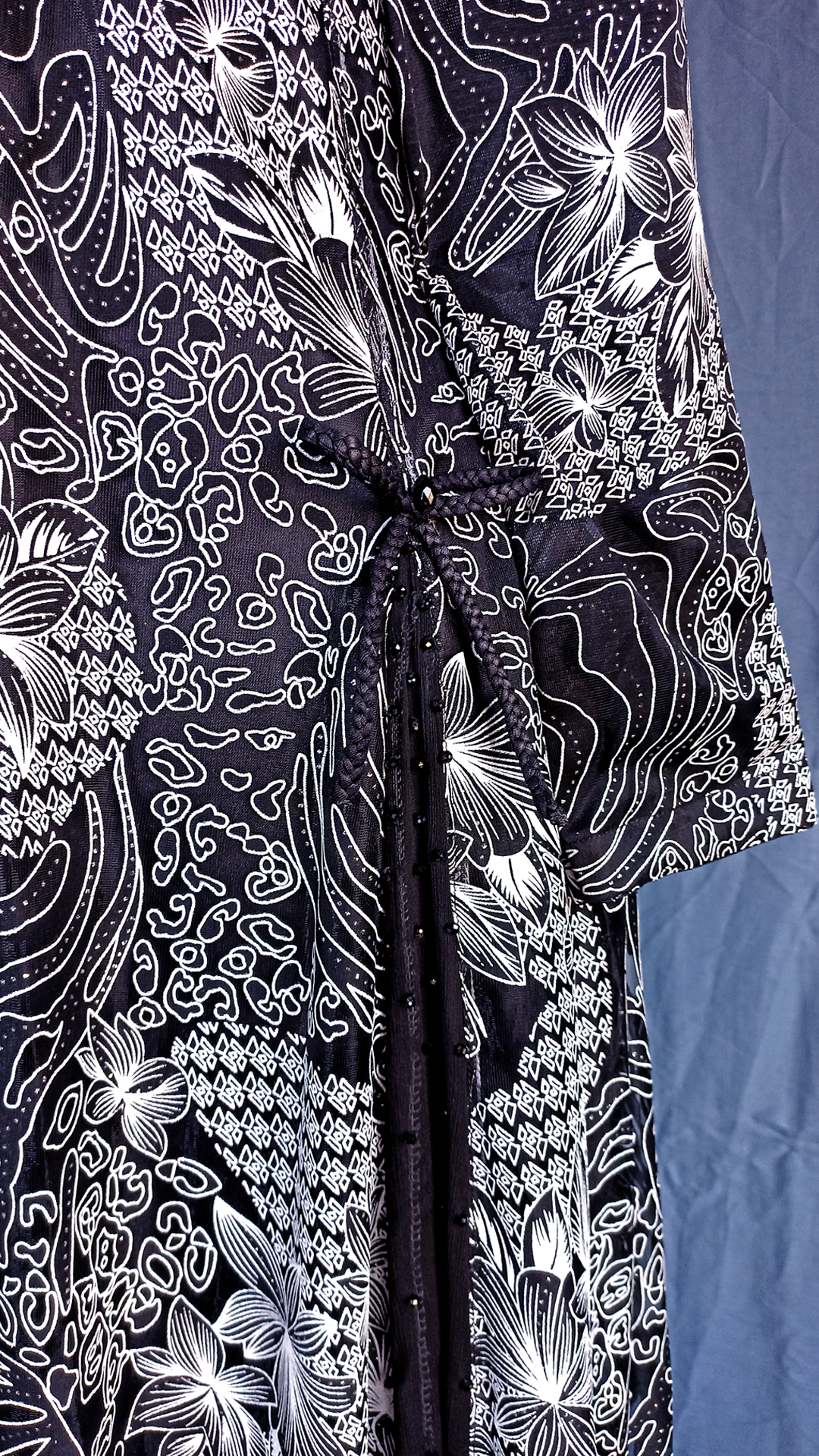 Black gown embossed with white paint on net fabric. Detailed with beads, chiffon panels and braided fabric on the neckline.