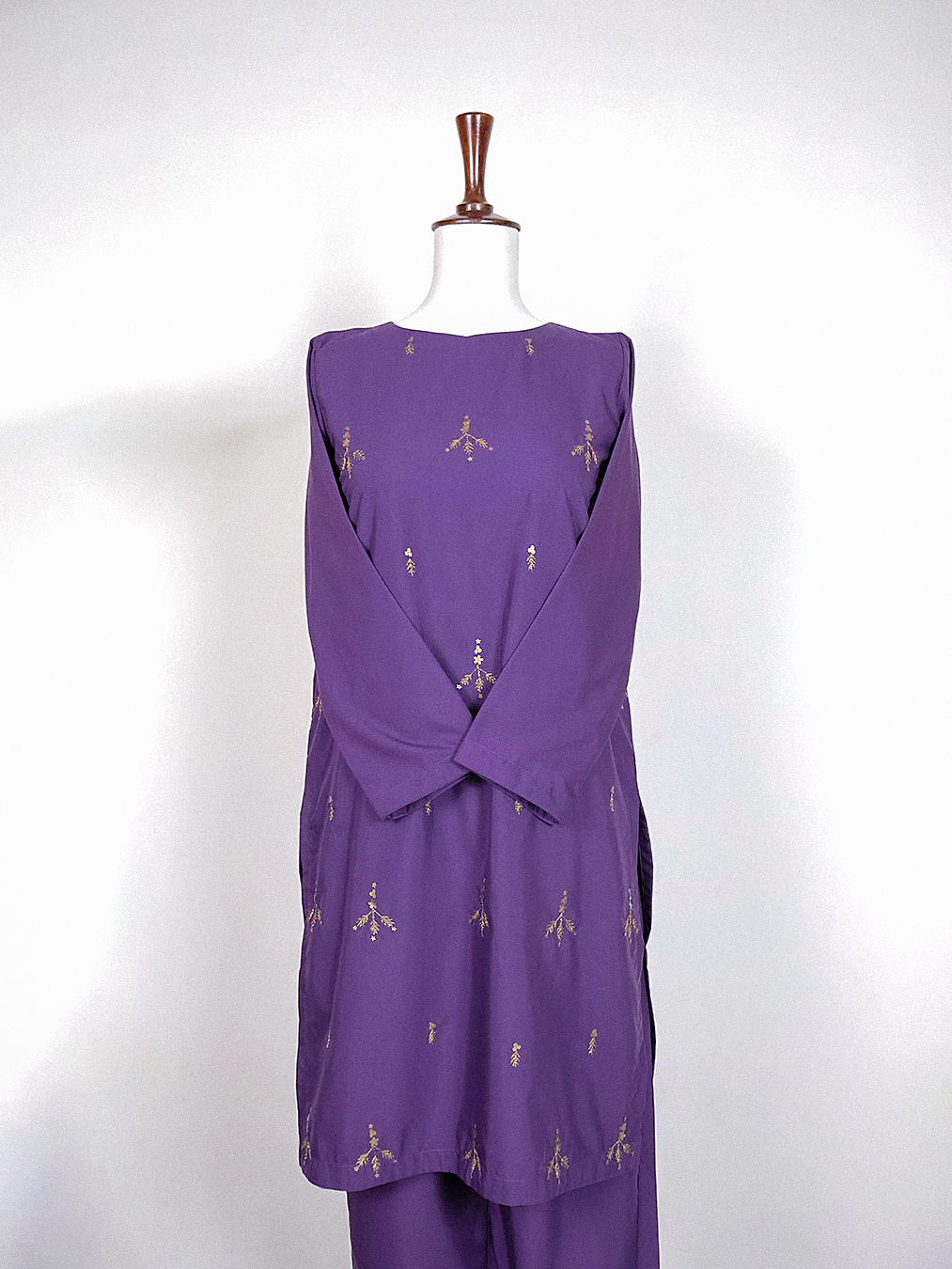 Grape Violet kurta and trouser embellished with hand-embroidered tilla-work and metallic flowers.